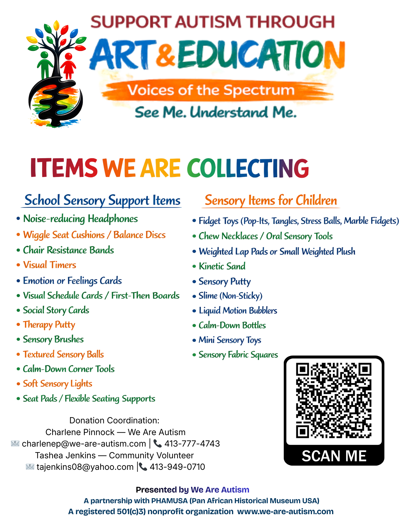 As part of our Voices of the Spectrum: See Me, Understand Me initiative, We Are Autism Inc., in partnership with the Pan African Historical Museum USA (PAHMUSA), is collecting new sensory and support items to benefit autistic children, their families, and local schools.